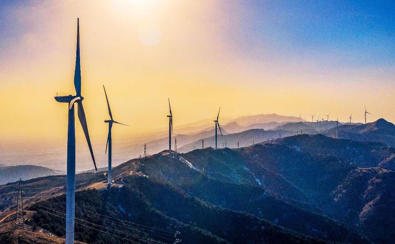 Photo taken on Feb. 26, 2022 shows wind turbines in Zhongtiao Mountain, Ruicheng county, Yuncheng, north China's Shanxi province. (People's Daily Online/Xue Jun)