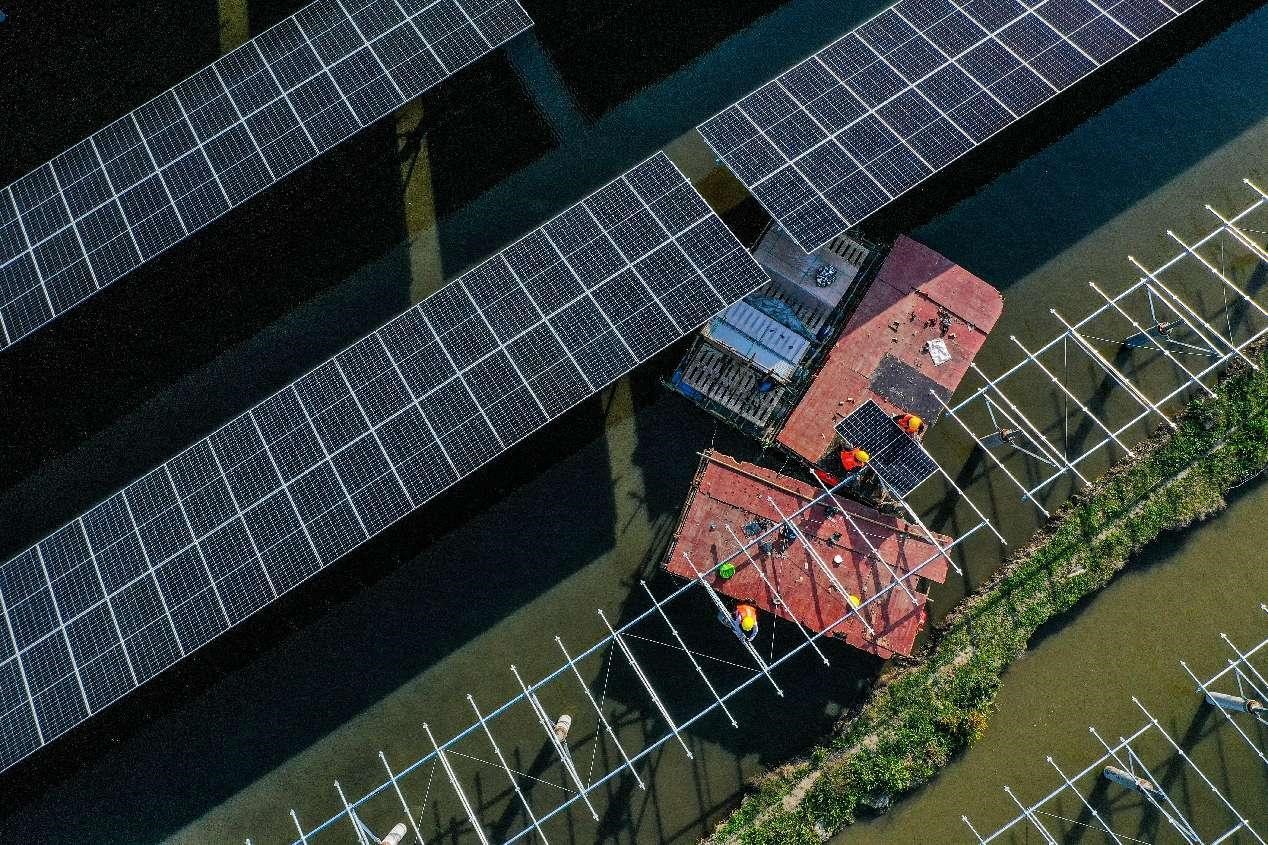 A 110MW fishery and photovoltaic complementary project is being built in Xilian township, Yi'an district, Tongling, east China's Anhui province, March 7, 2022. (People's Daily Online/Chen Chen)